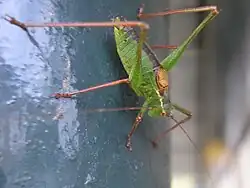 Leptophyes punctatissima can reach a body length of about 10โ15 mm (0.39โ0.59 in).[8] These bush-crickets are mainly grass-green with minute black speckles[6] (more evident in the nymphs), as reflected in the common and Latin name of the species. Its colouring and secretive lifestyle, hidden away in the undergrowth, mean that it often passes unnoticed. The dorsal surface of the abdomen features an orangey-brown stripe;[7] this is more pronounced in the male than the female. A yellow-white stripe extends backwards from the eyes.[5] The lower legs and feet are brownish. The antennae are twice as long as the body.[8] The species is brachypterous: the male's forewings are reduced to small flaps, and those of the female are even more reduced.[8] The hindwings are completely absent, and both males and females are flightless. The female's ovipositor is laterally compressed and curves sharply upwards.[7][8]