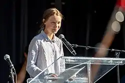 Swedish climate activist Greta Thunberg has been noted for her skills as an orator.[1] Her speech at the 2019 United Nations climate summit made her a household name.[2] Prior to her speaking engagements, Thunberg had demonstrated outside the Swedish parliament, the Riksdag, using the signage Skolstrejk för klimatet (School strike for climate).[3]