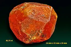 Spessartine forms a solid solution series with the garnet species almandine.[4][5] Well-formed crystals from this series, varying in color from very dark-red to bright yellow-orange, were found in Latinka, Rhodope Mountains, Kardzhali Province, Bulgaria.[12] Spessartine, like the other garnets, always occurs as a blend with other species. Gems with high spessartine content tend toward a light orange hue, while almandine prevalence induces red or brownish hues.[13]