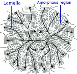 Growth from the melt would follow the temperature gradient (see figure). For example, if the gradient is directed normal to the direction of molecular alignment then the lamella growth sideward into a planar crystallite. However, in absence of thermal gradient, growth occurs radially, in all directions resulting in spherical aggregates, that is spherulites. The largest surfaces of the lamellae are terminated by molecular bends and kinks, and growth in this direction results in disordered regions. Therefore, spherulites have semicrystalline structure where highly ordered lamellae plates are interrupted by amorphous regions.[2][3]