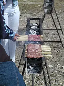 Arrosticini (rustelle or arrustelle in the local dialects; also known as spiedini or spiducci) is a class of traditional dishes of skewered grilled meat characteristic of Abruzzo cuisine.[1] They are typically made from mutton or lamb cut in chunks and pierced by a skewer. Arrosticini cooked on a brazier with a typically elongated shape, called furnacella, which resembles a gutter.