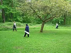 The Earl of Eglinton's head gardener at Eglinton Castle laid out the 16.53 acres (66,900 m2) of policies (from the Latin word politus meaning embellished[40]) and gardens. He used a variety of trees and shrubs, especially holly varieties, eventually producing a very fine setting for the school; much of the plantings remain to this day (2008).[41] There were between 50 and 100 varieties of trees within the grounds of Spier's and they used to be labelled with their botanical names.[42] The 1888 order for trees from Samson Nurseries survives and lists the trees ordered for the arboretum as 300 sycamores; 300 Scotch elm; 400 beech; 1000 Scotch fir (sic); 200 Austrian pine; 200 black spruce; 200 black spruce; 50 English elm; 200 Norway maple; 175 limes; 50 English oak; 50 turkey oak; 75 horse chestnut; 50 hornbeam; 200 weeping birch; 100 rhododendron; 100 rowans; and also ash and willows for the hedge.[43]