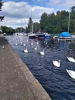 Mersey riverboats are moored in the Sankey Canal. The canal, although in water, is not navigable past the island. Halton Borough Council has the long-term aim of restoring the canal to use by watercraft and has committed to building a new swing bridge on the island and re-opening the slipway between the canal and Mersey. The council has also committed to finding an alternative water supply for the canal which has lost water formerly supplied by the since decommissioned Fiddler's Ferry power station.[9]