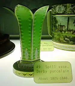 A spill vase, or spill holder is a small cylindrical vase or wall-hanging vase for containing splints, spills, and tapers for transferring fire, for example to light a candle or pipe from a lit fire. From the documentary record, they probably date back to the 15th century, though the heyday of specially made vases is the 19th century. Spills are made of tightly rolled paper tapers or very thin wood sticks; spill vases are mostly made of pottery, including porcelain, but a variety of other materials were used, such as wood, iron, brass, or even wall paper. There are also some examples made in glass, although these are mostly limited to the 1840s-50s.[1]