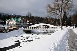 Špindlerův Mlýn lies at the confluence of the Elbe River and the stream Dolský potok. The Elbe source is located northwest of the town, near the Polish border, on the slopes of Mt. Violík at an altitude of 1,386 m (4,547 ft). About 1 km downstream are the Elbe Falls (Labský vodopád) which cascade about 30 m (98 ft) in depth.[4] On the Pančava Stream, which flows into the Elbe near the Elbe Falls, is the Pančava Waterfall, which is the highest waterfall in the Czech Republic with a height of 148 m (486 ft).[5] The Labská Dam with an area of 40 ha (99 acres) was built near the village of Labská in 1910–1914.[6]