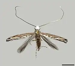 The length of the forewings is 2.78–3.61 mm. The forewings are mostly covered by dark-grey scales. There is a narrow stripe of white scales along the posterior margin. A zigzag edge, formed by short, oblique white fascia, separates this stripe from the remaining, mostly dark-grey area. The hindwings are completely covered by dark-grey scales.