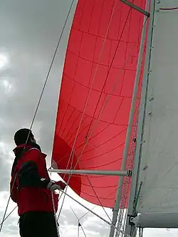 A spinnaker pole being used to set a conventional symmetric spinnaker