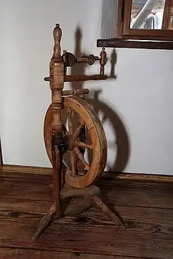 - the flax wheel, which is a double-drive wheel used with a distaff for spinning flax fibres for making linen;
