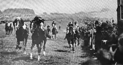 The Derby was run on an unusually hot day in front of an estimated crowd of 250,000 including the King and Queen.[8] Spion Kop started at odd of 100/6 (approximately 16/1) in a field of 19 runners. The favourite was the 2000 Guineas winner Tetratema a colt noted for his exceptional early speed but with dubious stamina.[9] Tetratema went into an early lead and set an extremely fast pace as he was challenged by Abbot's Trace (ridden by Steve Donoghue),[10] while O'Neill settled Spion Kop well back in the field. Tetratema dropped back soon after half way and Abbot's Trace led into the straight as Spion Kop made rapid progress from the rear. Spion Kop took the lead three furlongs from the finish and ran on strongly up the straight to win by two lengths from Archaic and Orpheus in a new race record time of 2:34.8. The most dramatic incident of the race occurred in the closing stages when Abbot's Trace was brought down in a collision with Sarchedon, who finished fourth.[10]