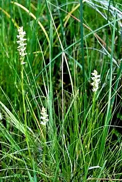 This orchid was first collected in 1968 and described to science as a species in 1990.[2] It produces an erect stem up to 50 centimeters tall.[3] The narrow leaves are arranged around the lower part of the stem and are up to 18 centimeters long. The inflorescence is a spiraling spike of flowers. The stem in the inflorescence is covered in glandular hairs. Each flower has curving white, cream, or yellow-tinged petals nearly one centimeter in length. Blooming occurs in July and August.[4] This and other orchid species depend on mycorrhizae, soil-dwelling fungi species, to assist with germination,[3] and for nutrition.[5]