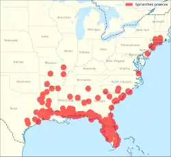 Spiranthes praecox is native to Alabama, Arkansas, Delaware, Florida, Georgia, Louisiana, Maryland, Mississippi, Missouri, New Jersey, North Carolina, Oklahoma, South Carolina, Texas, Virginia.[4]
