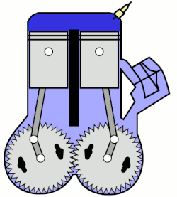 - Pressure from the ignited air-fuel mixture pushes both pistons downwards. Near the bottom of the travel, an exhaust port becomes exposed (at the rear of the left side cylinder in the animation), causing the exhaust gases to exit both cylinders.[1] At the same time, the intake port is exposed on the other cylinder, causing a fresh air-fuel mixture (which has been compressed in the crankcase by the downward movement of the pistons) to be drawn into the cylinder for the next cycle.