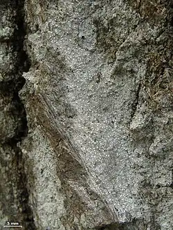 Sporodophoron americanum is a rare species of corticolous (bark-dwelling), crustose lichen in the family Arthoniaceae.[3] Found in northeastern North America, it was formally described as a new species in 2013 by the lichenologists James Lendemer, Erin Tripp, and Richard C.Harris.[4] Damien Ertz and Andreas Frisch transferred it to Sporodophoron in 2015.[5] The main morphological characteristics of the lichen include its blue-grey thallus, Trentepohlia algal photobiont partner, and white sporodochia. It has been assessed as an endangered species for the IUCN Red List.