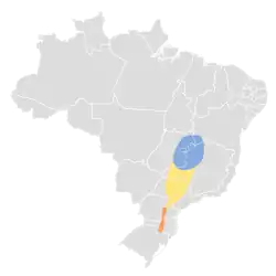 Tropeiro seedeaters breed in upland shrubby grasslands associated with the Araucaria forests of southern Brazil. They migrate northwards to spend the austral winter – the non-breeding season – in the Cerrado savannas of central Brazil. The range contains a narrow contact zone between the Tropeiro and plumbeous seedeaters, where the birds are segregated by habitat that contains little significant gene flow.[2]