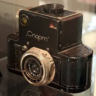 The "Sport" camera is the series production model of a prototype camera called Gelveta. The Gelveta was designed and built by A. O. Gelgar between 1934 and 1935. It is the earliest known production 35mm SLR camera ever to be built, but fewer than 320 examples were made. The actual launch date of the "Sport" is somewhat uncertain, however it was in series production by 1936 and must undoubtedly be one of the two earliest generally available SLR cameras using the 35mm film format, the other being the German Ihagee Kine Exakta, launched in 1936. It was manufactured by the Soviet camera factory Gosudarstvennyi Optiko-Mekhanicheskii Zavod, The State Optical-Mechanical Factory in Leningrad. GOMZ for short. The camera name is engraved in Cyrillic on the finder housing above the lens: „Спорm“. The manufacturer's prism logo in gold on black with the factory initials ГОМЗ (GOMZ) is shown behind a circular magnifying window on the top left camera front. An estimated number of 19,000 cameras were made before Leningrad was besieged in September 1941 and suffered heavy damage. The design concept was not continued later.[1]