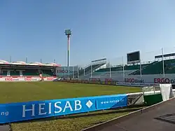 The corners of the stadium, with the exception of the southern corner on the side of the main stand, are currently not covered with stands. While there are two large advertising boards and the floodlight masts on the side of the back straight, there is a view from the entrance area of the North Stand between the North and Main Stands on the northern side of the Main Stand. There is also a floodlight mast here. There is also a passageway between the main stand and the south curve, so that it is theoretically possible to see a few square meters of the pitch from the street without a ticket. In total, there are 8,500 seats, slightly more seats than standing room (8,126). All seats are covered.