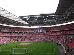 - Wembley Stadium (England football team) The newly reconstructed Wembley has also been used by the Great Britain rugby league team, and for major club matches in rugby league. It can seat 90,000 people, second largest capacity in Europe.