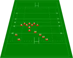 Before the ball is snapped the offensive team lines up in a formation. When the team is in formation and the quarterback gives a signal, either by calling out instructions or giving a non-verbal cue (a so-called "silent count"), the center snaps the ball to the quarterback and a play begins. An offensive play is considered a passing play if the ball is passed by the quarterback to an eligible receiver, and a running play if not.[11]