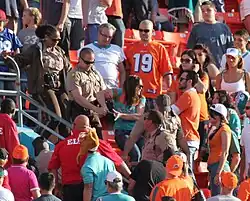 - In 2024, following the AFC Divisional Round NFL playoff game between the Buffalo Bills and Kansas City Chiefs at Highmark Stadium in Orchard Park, New York where the Chiefs defeated the Bills 27–24, Chiefs quarterback Patrick Mahomes was pelted with snowballs from the fans[34] as was star tight end Travis Kelce[35] and star linebacker Drue Tranquill.[36] Coming into the game, Buffalo had two previous postseason encounters with Mahomes and Kansas City, both of them resulting in losses, in 2021[37] and in 2022,[38] albeit at Arrowhead Stadium in Kansas City. The Buffalo region also had to deal with heavy snowfalls in the days leading up to the game,[39][40] a situation that also occurred prior to the Bills’ previous playoff game against the Pittsburgh Steelers the preceding week. In both situations, the team had to hire fans to shovel snow out of the stadium’s walkways and paid them $20 per hour for doing so.[41] Following the game, Tranquill took to social media, calling out the fan who threw a snowball at him, claiming that he caught the snowball and was ready to retaliate had it not broken in his hand upon catching it.[42]