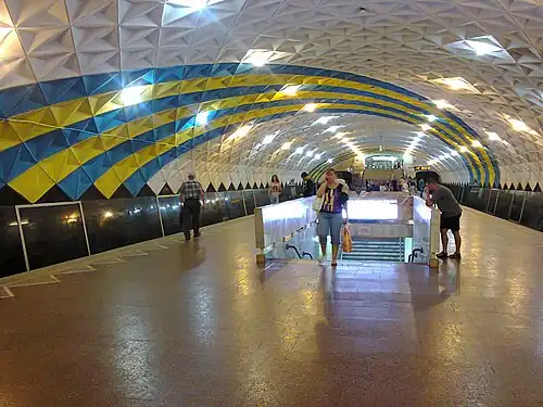 Sportyvna (Ukrainian: Спортивна, ⓘ) or Sportivnaya (Russian: Спортивная) is a station on the Kharkiv Metro's Kholodnohirsko–Zavodska Line. It was opened on 23 August 1975. It is located in the southwestern part of the city's center, beneath the Plechanivska Vulytsia and the Derzhavinska Vulytsia junction. The station received its name from the word sport, due to the neighbouring FC Metalist Kharkiv Stadium, the biggest in Kharkiv. During the planning stage the station was to be called Stadion.