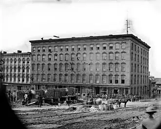 The Spotswood Hotel opened shortly before January 19, 1861, on the southeast corner of 8th and Main streets.[1] The hotel opened three months before the start of the American Civil War in April 1861.[2][3] The hotel was owned by Joseph H. Crenshaw. It was advertised in the Richmond Enquirer as "elegantly finished" and located in the "best part of the city." It also became the quarters for the Richmond Howitzers, a Virginian militia, and later the location of the Confederate Post Office.[4][5]