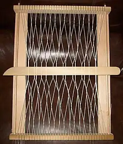 In principle, sprang may be regarded as a practical application of the fiber manipulation techniques used in the children's game known as cat's cradle.[1] Sprang is made by preparing a set of warp threads either on a rectangular frame or between a pair of beams. The craftsperson then generates a fabric by interlinking the warp threads. Unlike most textile production techniques that add new rows at the end of completed rows, sprang works upon the center of a group of fibers and the material grows inward from both ends with symmetrical top and bottom halves. The craftsperson must maintain control of the center area or the structure unravels: most sprang worked upon has too many fibers to keep in hand, so rods or sticks maintain the appropriate fiber positions. The fiber manipulation itself is done by the craftsperson's fingers. Decorative patterns may be generated by regular variations in the fiber crossings. As crossings accumulate the craftsperson beats the material flat with a stick.[2][3] Work continues with the material growing from both edges toward the middle until the center band becomes too tight to continue work.[4] The completed fabric is either separated into two identical items or permanently secured at the middle to stabilize the contrary twists.[3] In traditions where two halves of sprang are not severed by cutting, this center seam is a telltale sign of sprang manufacture.[3]