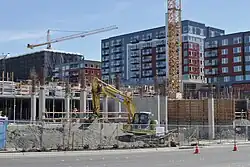 A groundbreaking ceremony was held on September 16, 2013, to celebrate the start of site demolition at the future Spring District.[1][24] Demolition of the Safeway distribution center was completed in January 2014,[25] and construction of the first phase, a 79-unit apartment building, began in June 2015.[26] Construction of all five buildings in the first phase will be finished in 2017. The second phase began construction in November 2016.[27]