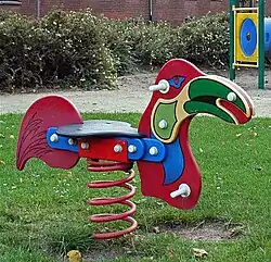 A spring rider or spring rocker is a bouncy, outdoors playing device, invented in the 1960s in Italy by the company Pozza.[1] It mainly consists of a metal spring beneath a plastic or wooden central beam or flange, with 1 to 4 plastic or fiberglass seats above it. When a person sits on it, the structure moves and bounces. Spring riders are common in many playgrounds. They are often designed to look like an animal or a vehicle.