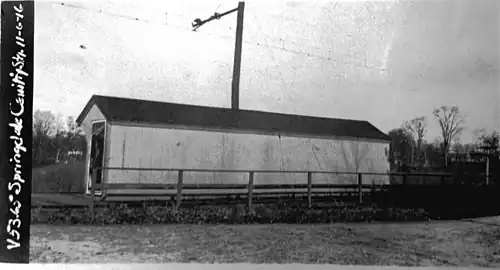 Springdale Cemetery station first opened in 1898.[1] It served St. Johns Cemetery, of St. Johns Catholic Church in Stamford, and was primarily used by funeral attendees.[1] In some cases, the bodies of the deceased passed through the station as well.[1] Traffic to the station began to decline after the Stamford Street Railroad was extended to Camp Avenue.[1] By the 1960s, all station structures were removed, and service took place at a small patch of ballast at the Camp Avenue grade crossing.[1] On August 20, 1969, two trains collided at the Hoyt Street crossing just north of the station. Four people were killed and forty more were injured.[2] On July 17, 1972, the station was closed and merged with the Springdale station located 0.5 miles (800 meters) to the south.[3]