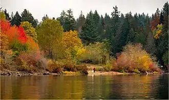 Roughly cross-shaped with four arms, it is over 25 kilometres in length, and has 90.8 kilometres of shoreline.[1] Former[2] home of the last Martin Mars type waterbombers, and near Port Alberni, Sproat Lake is a popular summer recreational area for the Alberni Valley. Highway 4 runs along its north shore.[3]