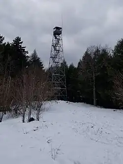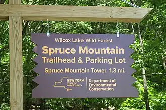 Spruce Mountain is a mountain in the Kayaderosseras Range in the town of Corinth in Saratoga County, New York. The 2,005 foot (611 m) summit is accessible via a 1.3-mile (2.1 km) trail and is topped with a 73 foot (22 m) fire tower affording a more than 120-mile (190 km) panoramic view from the Adirondacks to the Catskills, and east to Vermont. The tower, built in 1928 and refurbished in 2015, is one of only 23 remaining in the Adirondack Mountains.[2]