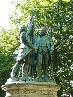 Famed publisher Joseph Pulitzer (1847–1911), impressed by the work Bartholdi had done in executing the Statue of Liberty, commissioned him to produce another statue, one emblematic of the French-American friendship. The subject matter, General George Washington and Gilbert du Motier, Marquis de Lafayette, comrades-in-arms during the American Revolutionary War, was an easy choice. The sculptor designed the bronze statue, which depicts Washington and Lafayette on a marble plinth, clothed in military uniforms, shaking hands; the French and American flags serve as a backdrop. Dedicated in 1895, the statue was installed in the Place des États-Unis. A few years later, Charles Broadway Rouss, the New York City department-store tycoon, purchased an exact replica of the Washington-and-Lafayette statue which he donated to the people of New York City for placement in Morningside Park in the Morningside Heights neighborhood of Manhattan.