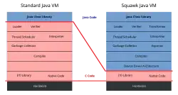 Squawk is a Java micro edition virtual machine for embedded system and small devices. Most virtual machines for the Java platform are written in low level native languages such as C/C++ and assembler; what makes Squawk different is that Squawk's core is mostly written in Java (this is called a meta-circular interpreter). A Java implementation provides ease of portability, and integration of virtual machine and application resources such as objects, threads, and operating-system interfaces.