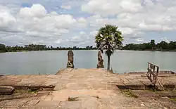At present Srah Srang measures 700 by 350 m and is still partially flooded. As other barays, maybe there was a temple standing on an artificial island in the middle of it, as suggested by finding of a basement. The landing-stage, opposite the entrance to Banteay Kdei, is a popular site for viewing the sunrise. It is cruciform, flanked by nāga balustrades which end with the upright head of a serpent, mounted by a garuda with its wings unfurled. The steps that lead down to the water are flanked by two guardian lions.