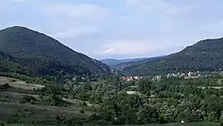 Ihtimanska Sredna Gora is limited to the west by the valley of the Iskar, to the north by the valleys of Sofia, Saranska, Kamarska and Zlatitsa–Pirdop, to the east by the Topolnitsa, to the south by the Rila mountain range.[3] It covers an area of 1,370 km2 with an average elevation of 750 m, thus being the smallest in territory and the highest in average altitude of the three divisions.[3] Ihtimanska Sredna Gora is subdivided in three sections — Vakarelsko–Belishki, Shipochansko–Eledzhiski and Ihitmanski. The first section includes the mountains of Lozen (1,190 m) which is the westernmost point of the whole mountain range, Vakarelska (1,090 m) and Belitsa (1,221 m). The river Gabra forms a small valley between Lozen and Vakarelska. Shipochansko–Eledzhiski section is located between the Samokov Valley in the west and the Topolnitsa in the east and links with Rila and Konstenets–Dolna Banya Valley in the south. It includes the ridges of Shipochanski Rid (1,312 m), Shumnatitsa (1,392 m), Septemvriyski (1,275 m) and Eledzhik (1,186 m).[3] Between these two sections is situated the Ihtiman Valley at an altitude of 620 m to 700 m.[4]