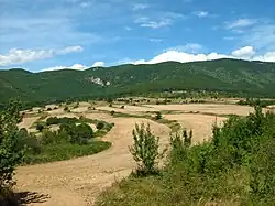 In most of Sredna Gora, the rivers originating from the mountain range have predominantly rain-snow feed[8] and high water in early spring, due to the less pronounces snow retention and the predominantly pluvial element in the river flow, compared to the higher Bulgarian mountain ranges. In its lowest areas in the east, the rivers are almost exclusively with rain feed. Most of these rivers have temporary flow and in places with deforested or eroded watersheds, at times, they also have a pronounced brief torrential flow. In the highest parts of Sredna Gora the river flow is 15 L/s per km2, due to the relatively small amount of precipitation, lower snow retention and stronger evaporation. At lower elevation, particularly in the east, this amount is reduced to 1 L/s per km2, due to the small precipitation, the significant evaporation, the negligible slopes and the permeable ground. The average river flow for the whole mountain range is 4.7 L/s per km2.[9] The water resources in Sredna Gora are more limited compared to other mountain ranges in Bulgaria, due to lower average altitude, higher temperature and lower snow retention.[9]