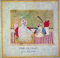 ![]() Painting of Sri Chand, elder son of Guru Nanak and founder of the Udasi sect, with a visitor and fly-whisk attendants, circa early-19th century. | |