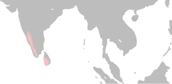 The Indian subspecies is found along the Western Ghats mostly south of Goa but as they are secretive, records are rare and their presence has often been detected only upon the discovery of injured individuals. The breeding season is in winter when the distinctive song consisting of multiple whistles with inflections can be heard.[11][12]