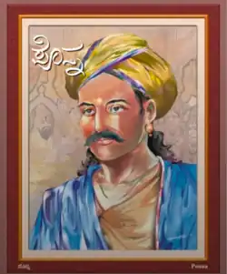 Ponna (c. 945) was a noted Kannada poet in the court of Rashtrakuta Emperor Krishna III (r. 939–968 CE). The emperor "Krishna III" honoured Ponna with the title - "Ubhaya Kavichakravarthi " (emperor among poets) because of his command over both Kannada and Sanskrit.[1] and for their rich poetic imagery, devotion to Jain themes, and courtly refinement.[2][3][4][5] Ponna is often considered one among the "three gems of Kannada literature" ("Ratnatraya"), lit meaning "Three gems"; Adikavi Pampa and Ranna being the other two) for ushering it in full panoply.[4][6][7] According to the scholar R. Narasimhacharya, Ponna is known to have claimed superiority over all the poets of the time.[3] According to scholars Nilakanta Shastri and E.P. Rice, Ponna belonged to Punganur, now in Andhra Pradesh, but later migrated to Manyakheta (in present-day Kalaburagi district, Karnataka), the Rashtrakuta capital. He is best remembered for his classic Jain puranas such as "Shantipurana" (shantinatha purana}, which narrates the life of Shantinatha, the 16th Tirthankara of Jainism, and Bhuvanaika-Ramabhyudaya, a eulogistic poem on his patron king.[8]