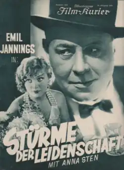 Storms of Passion (German: Stürme der Leidenschaft) is a 1932 German crime film directed by Robert Siodmak and starring Emil Jannings, Anna Sten and Trude Hesterberg. It is regarded as a precursor of film noir.[1] The film was produced by Germany's leading film company UFA and shot at the Babelsberg Studios in Berlin. The sets were designed by the art director Erich Kettelhut. It premiered at the Ufa-Palast am Zoo on 22 January 1932.[2][3] An alternative French language version Tumultes, starring Charles Boyer, was also released.