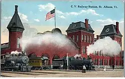 The Vermont and Canada Railroad, under control of the Vermont Central Railroad (VC), began service between Essex Junction and Rouses Point through St. Albans on January 10, 1851.[2] The original VC combination depot (passenger and freight services in one building) has two platform tracks.[3] In 1862, the VC began construction of a major expansion of its main shops in St. Albans, hometown of VC president John Gregory Smith.[4]