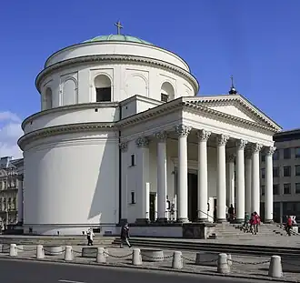 The church was designed by Chrystian Piotr Aigner on a circular plan surmounted by a dome, in Neoclassical style, between 1818 and 1825. The inspiration for the design was the Pantheon in Rome.[1] The foundation stone was laid on 15 June 1818 by Treasury Minister Jan Węgliński, standing in for an indisposed General Józef Zajączek, Namestnik of the Kingdom of Poland.[1] The church was consecrated on 18 June 1826 by Primate Wojciech Skarszewski. The main altar was adorned with an oil painting of The Crucifixion of Jesus by Franciszek Smuglewicz.[1]