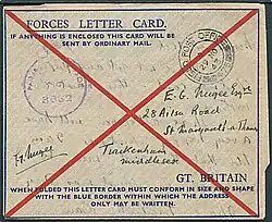 A postal stationery airmail letter sheet, entitled "Forces Letter Card", now commonly known as an aerogram, was made available during World War II for British military forces[7] and a few were issued with a large St. Andrew's cross printed on the front portion of the air letter.[8][9]
