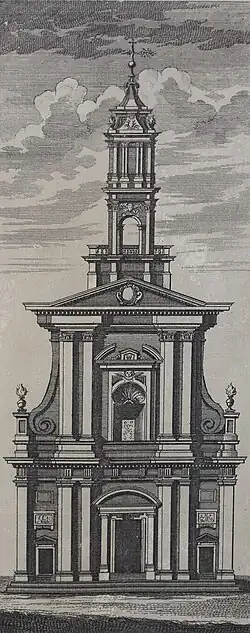 The building of the church in baroque style commenced around 1720, to a design by Isaac Wills or Thomas Burgh.[2] It bears a resemblance to the baroque Church of the Gesù and the San Giacomo degli Incurabili in Rome for the base with the top resembling that of the Sant'Agnese in Agone. The original façade was never completed above the first floor.[3]