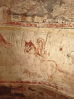 Inside the church there are some wall paintings, which include a two headed eagle and a horse with a female rider, who is believed to be Mamica Kastrioti.[5]