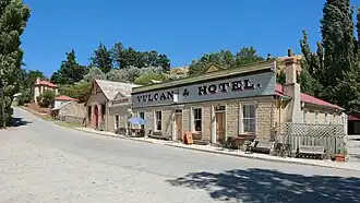 The Vulcan Hotel (at 44°52′15″S 169°48′40″E / 44.87083°S 169.81111°E) is a restored public house located on the main street of St Bathans, and is the town's main tourist attraction. Originally called the Ballarat Hotel, the building was originally constructed in 1882 of mud brick.[3] The building is registered as a Category I historic place by Heritage New Zealand.[4] The building is notable as possibly the country's most famous haunted building.[5] Room 1 of the hotel is reputedly home to the spirit of a young woman, thought by some to be a prostitute known "the Rose", who was strangled to death in the hotel in the 1880s.[6]