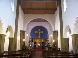 St. Bernward's Church is a basilica consisting of three naves, but unlike the other churches in Hildesheim, its apse and the altar are in the north of the building.[4] The church facades to the south. The tower, which looks very similar to the tower of the Cathedral, is placed at the southern end.