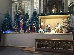 The church building has a shrine-like atmosphere with 32 statues, 4 murals, 2 paintings, beautiful stained-glass windows, and stations of the cross. An additional 10 statues are located in a small park/shrine to Mary to the south of the church. In 2015 the parish counted 460 families.[6]