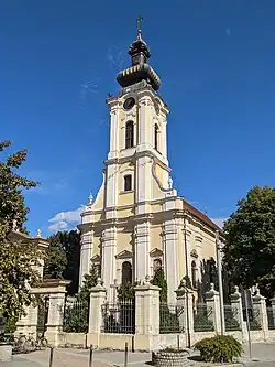 The church is designed with a single-nave layout, featuring a spacious semicircular apse at the east end and a tall bell tower rising above the western façade.[1] Over the years the building has undergone numerous interventions, the first of which took place in 1811.[1] The church was originally dedicated to St. Stephen yet it was later rededicated to St. Demetrius in 1997.[2] St. Demetrius was a deacon of Bishop Irenaeus, and both were executed by Roman legionaries on one of the bridges over the Sava River in imperial Sirmium in 204 AD.[3]