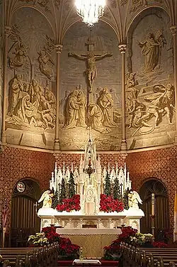 The murals of St. Francis Xavier Church have been called "the most significant examples of ecclesiastical art in West Virginia today" by the West Virginia Department of History and Culture. The murals are noteworthy because of their three-dimensional, bas-relief style also known as tromp l'oeil painting. The artist was Daniel Muller of Munich, Germany who came from New York City. Muller had painted other churches designed by Patrick Keely. Muller's most noted work before St. Francis Xavier was the Church of the Gesu in Montreal, Canada another Keely designed church. Today St. Francis Xavier parish has over 375 families and a parish population of over 1000 persons. St. Monica parish in nearby Lubeck, composed of 42 families, shares staff with St. Xavier. The parish supports two Catholic schools. Parkersburg Catholic Elementary School serves pre-school through grade 5. Parkersburg Catholic High School serves students in grades 6 through 12. Father John Rice is the current pastor of the parish.[6]